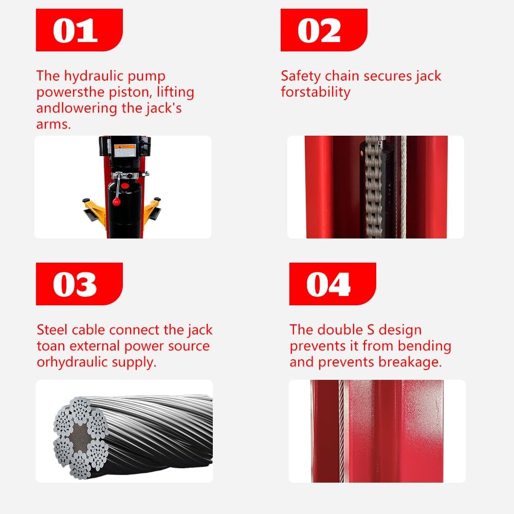 • Screw-on pad and extension support adaptor sets +100mm. Added overhead safety shutoff bar. Feet-protection safety guardrails with tools box. Top level hydraulic system with 220V/60HZ/1PH