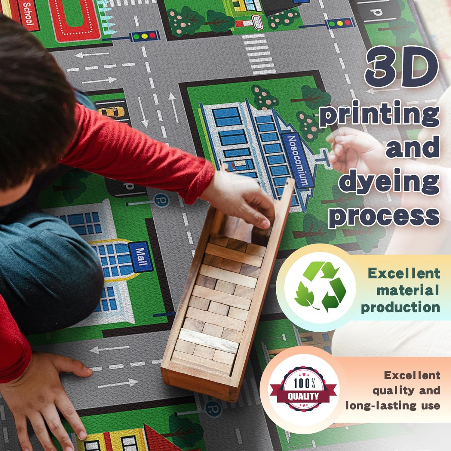 - Detailed & Recognizable Scenes:Our carpet includes facilities such as a bakery, bookstore, department store, pharmacy, supermarket, hair salon, and school, allowing children to enjoy having a city of their own that they can control.