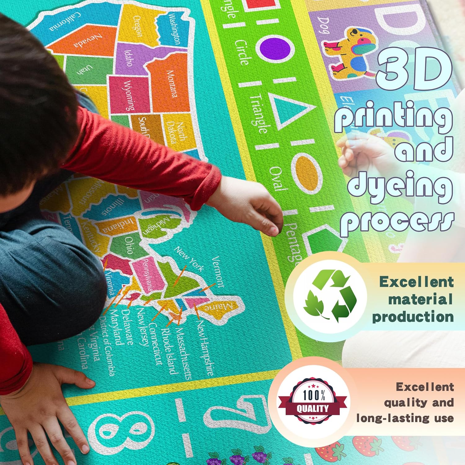 - Educational Elements Galore:Features a colorful US map, ABCs paired with animal illustrations (e.g., Alligator for A), numbers 1 - 10, basic shapes, and seasons. Creates opportunities for kids to explore geography, literacy, numeracy, and seasonal concepts during play.