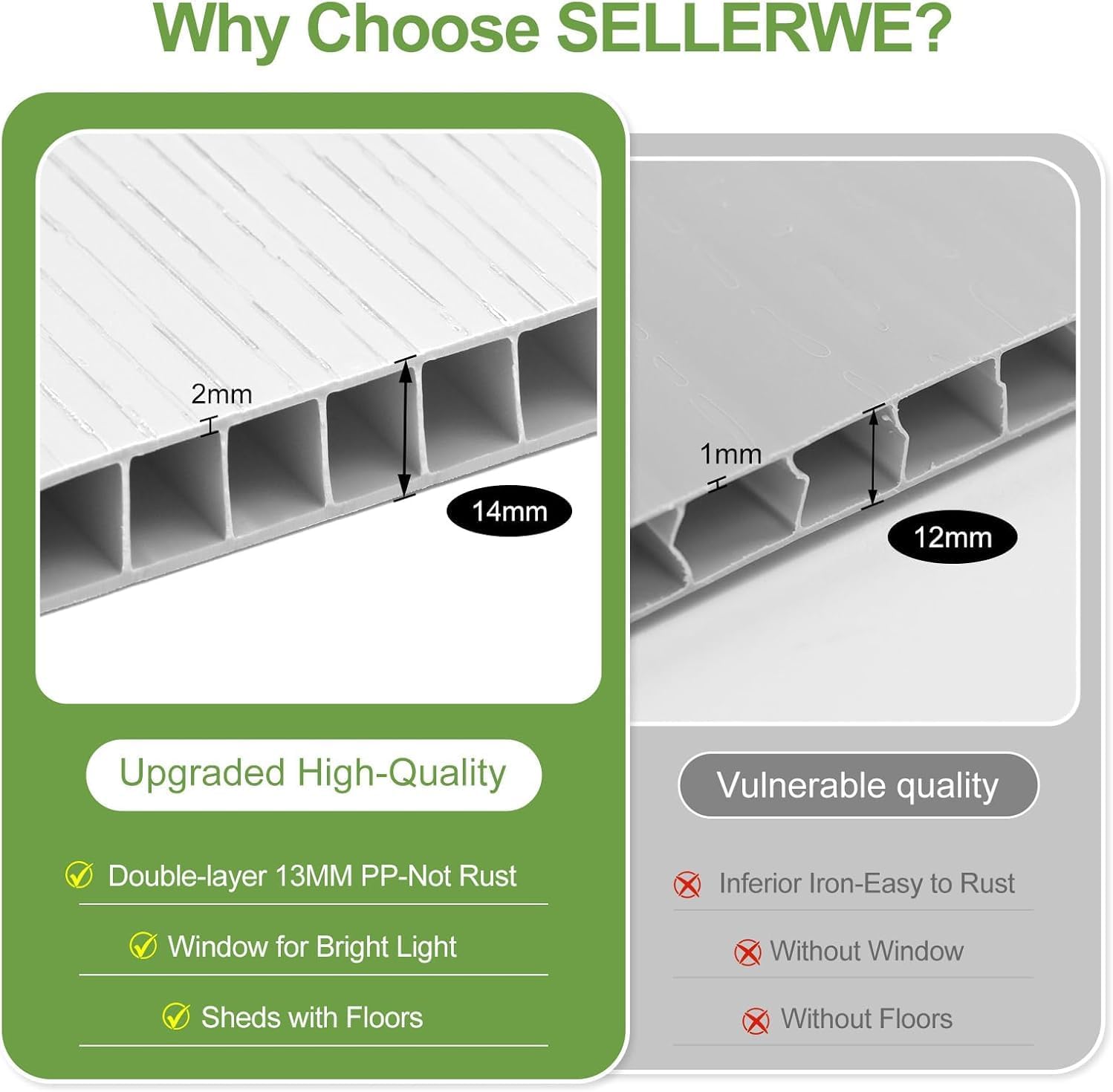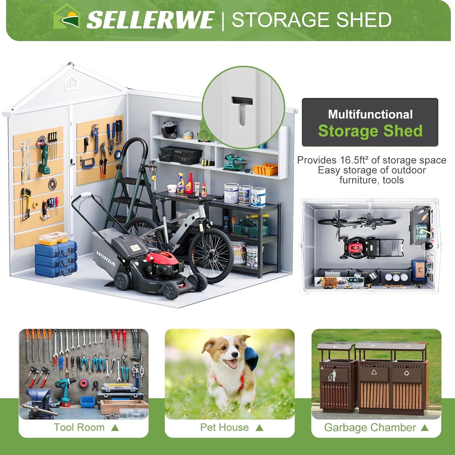 - 【PREMIUM MATERIAL STORAGE SHED WITH FLOOR】: The 14mm tough double-wall resin construction, 0.6 mm galvanized steel frame and impact-resistant floor are designed for long-term durability. The double-wall panels are waterproof and moisture-proof, allowing worry-free use in all weather conditions. It is weather-resistant, waterproof, and UV-resistant-no peeling, rotting, or rusting. The screws are embedded to ensure aesthetics and safety
