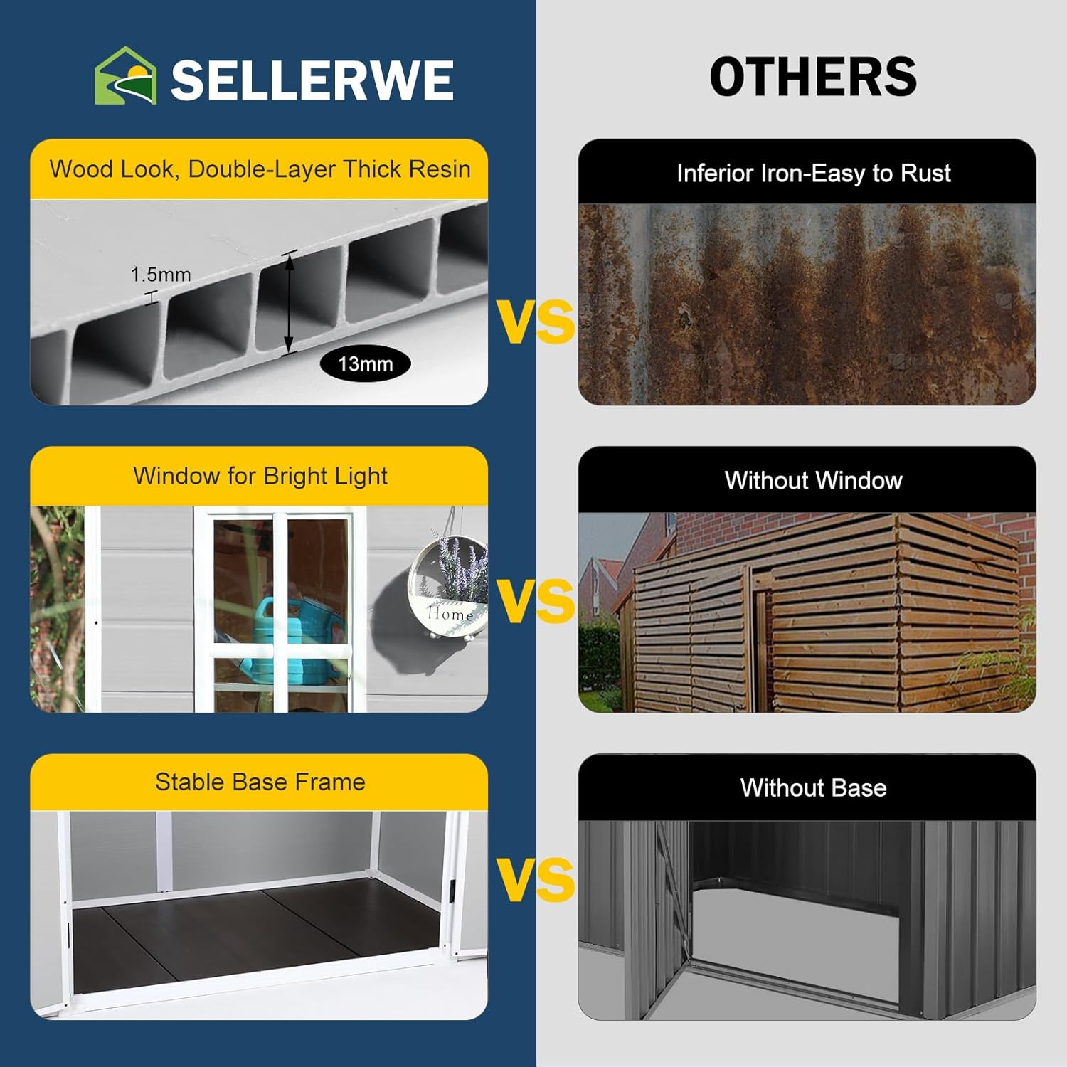 - π‘[PREMIUM MATERIAL STORAGE SHED WITH FLOOR]: The 13mm tough double-wall resin construction and impact-resistant floor are designed for long-term durability. The double-wall panels are waterproof and moisture-proof, allowing worry-free use in all weather conditions. It is weather-resistant, waterproof, and UV-resistantβno peeling, rotting, or rusting. The screws are embedded to ensure aesthetics and safety.