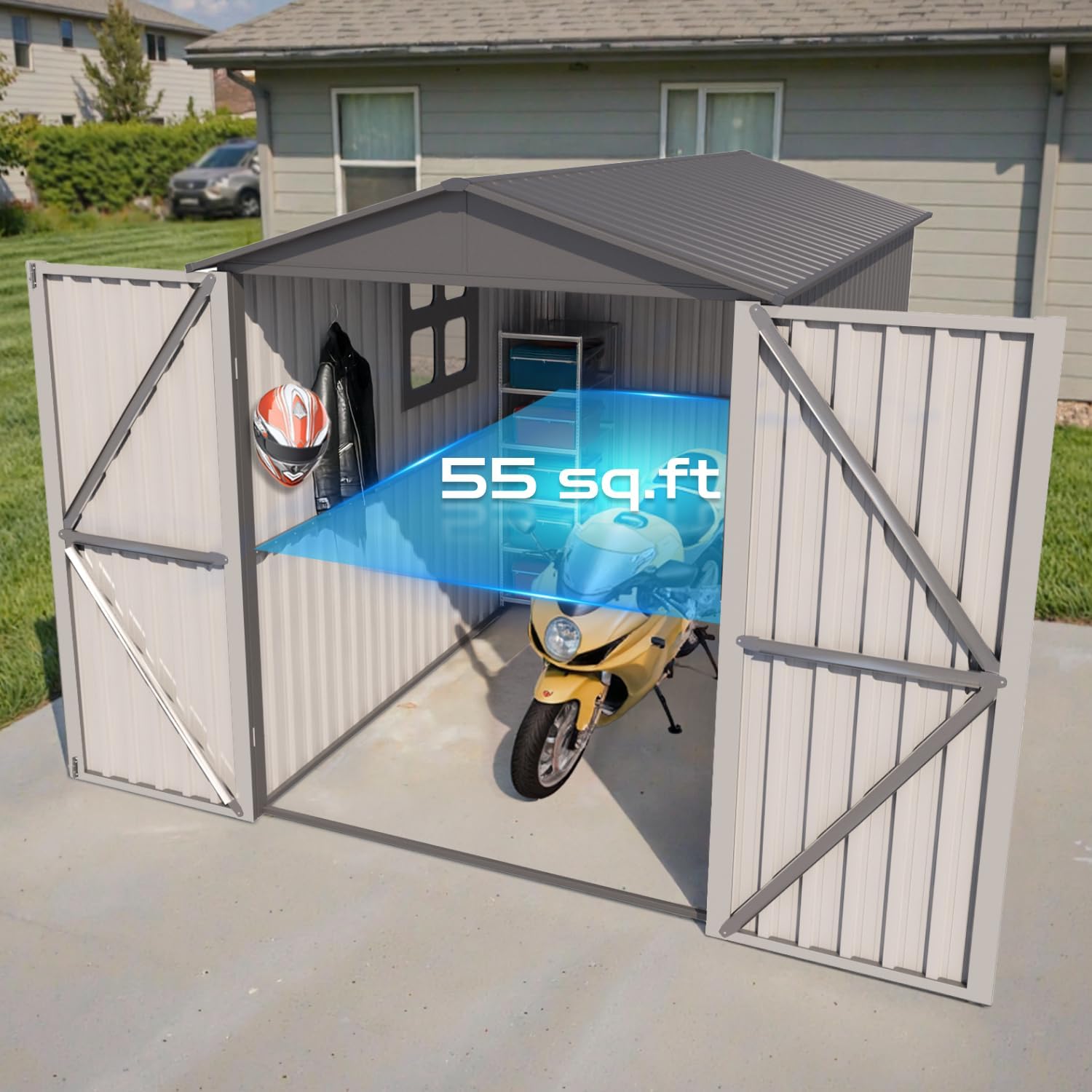 5’ x 10’ Motorcycle Storage Sheds, Metal Shelter & Garage with Windows and Lockable Door Handle, Heavy Duty Vehicle Shed for All Weather, Anthracite with White Trim