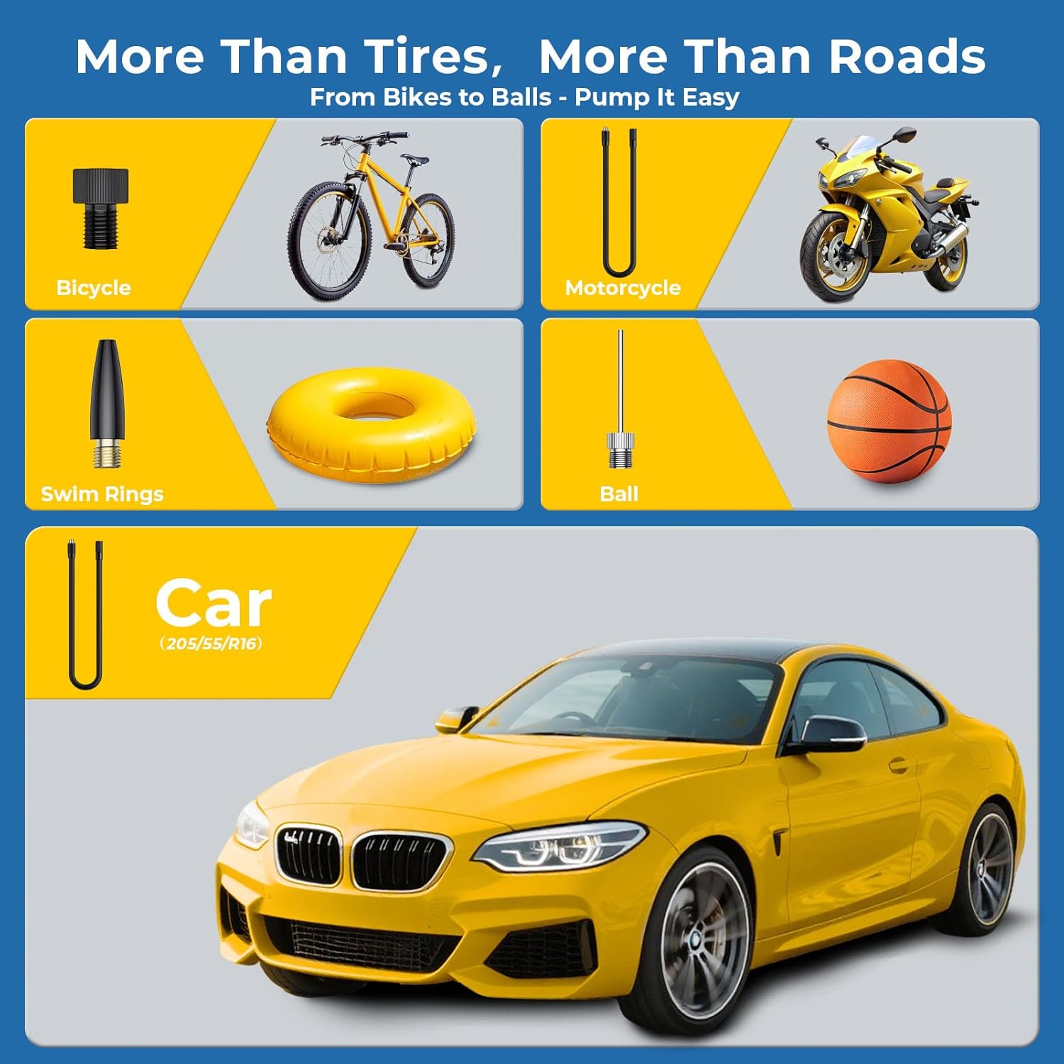 - [Preset Modes, Easy Use] Not sure what tire pressure to set? Choose DWW tire inflator portable air compressor! The air pump for car tires offers 5 preset modes - car, bicycle, motorcycle, ball, and custom - just power on and select. With 4 pressure units and an LED light for dark use, the portable tire inflator for car suits different needs. No need to check manuals, even beginners can use the electric air pump confidently. One tire inflator portable air compressor meets the whole family's needs