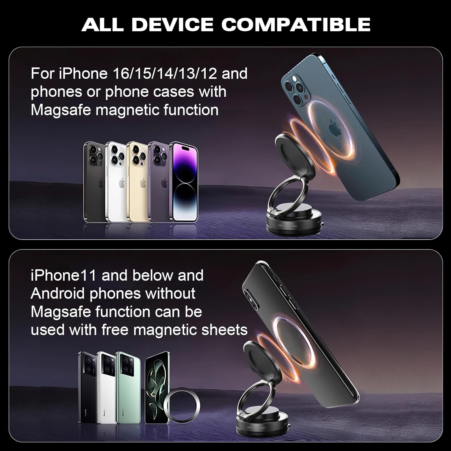 - 【Universal Fit】This vipbu phone mount is compatible with all smartphones. Suitable for iPhone 12 and above models or phone cases with Magsafe magnetic function. No additional patches are required and it can be used directly. iPhone 11 and below models and Android phones without Magsafe function can be used with the free magnetic sheet