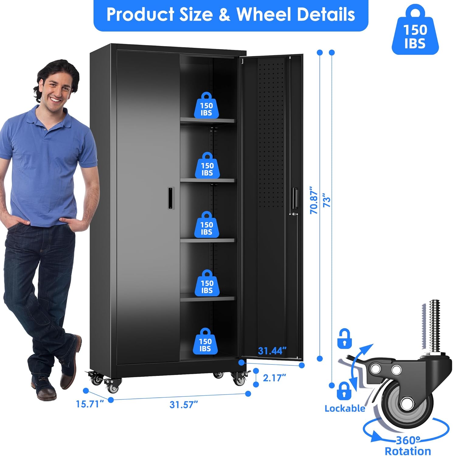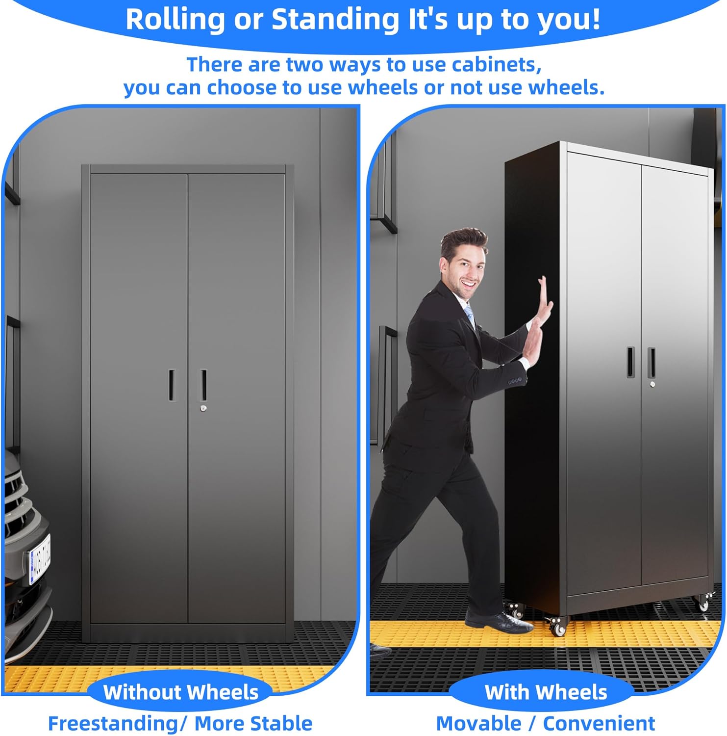 - 360 Degree Rotating Wheels for Effortless Mobility: Move the garage storage cabinet cabinet with ease using its 360-degree rotating, lockable wheels, offering smooth, silent transport across floors. The wheels are detachable—install them for mobility or remove them for stationary use, ensuring versatility without compromising stability;