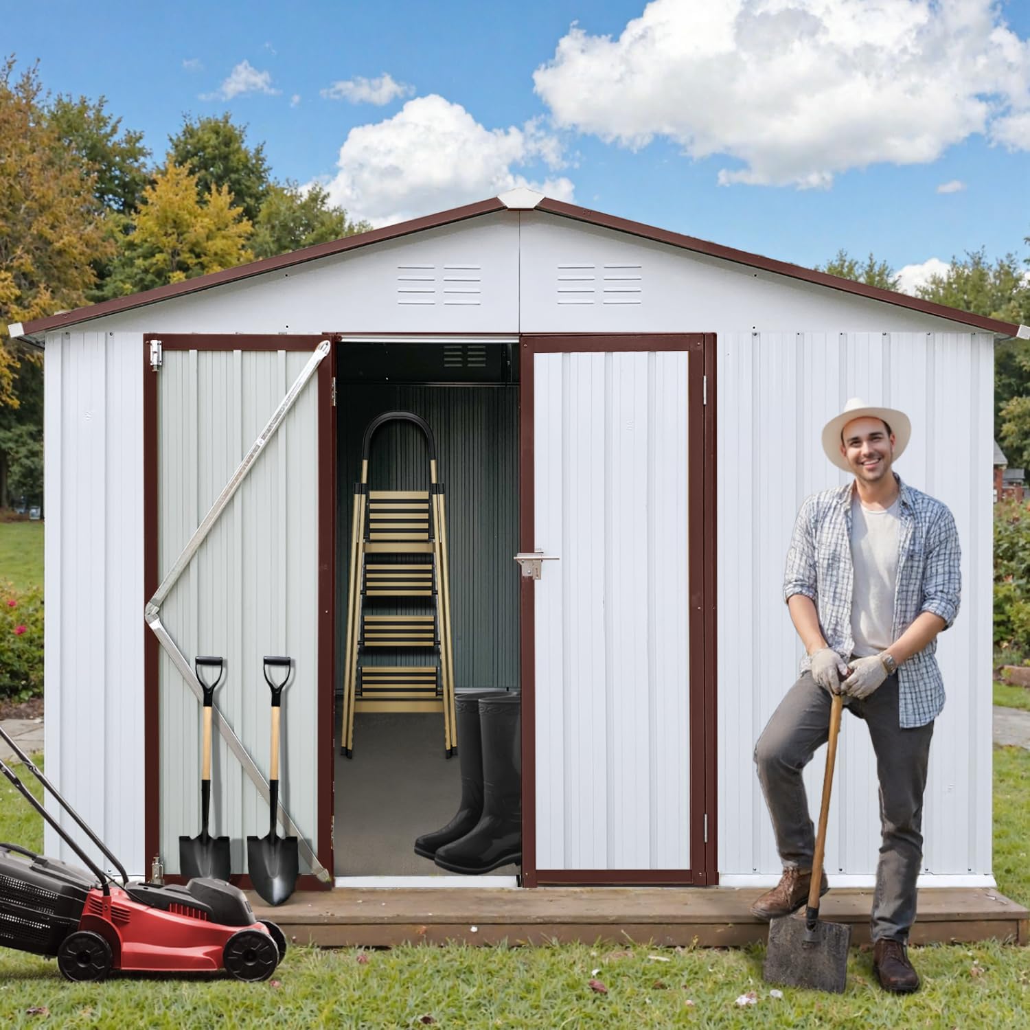 - đłăVersatile Outdoor Storageă Maximize your outdoor space with this versatile metal shed, ideal for patios, backyards, gardens, or lawns. Its spacious, well-designed interior accommodates lawnmowers, gardening tools, seasonal decorations, bicycles, or even serves as a secure hobby workshop. This casita de patio keeps your belongings organized and protected from the elements, providing a flexible solution to maintain a tidy and functional outdoor area