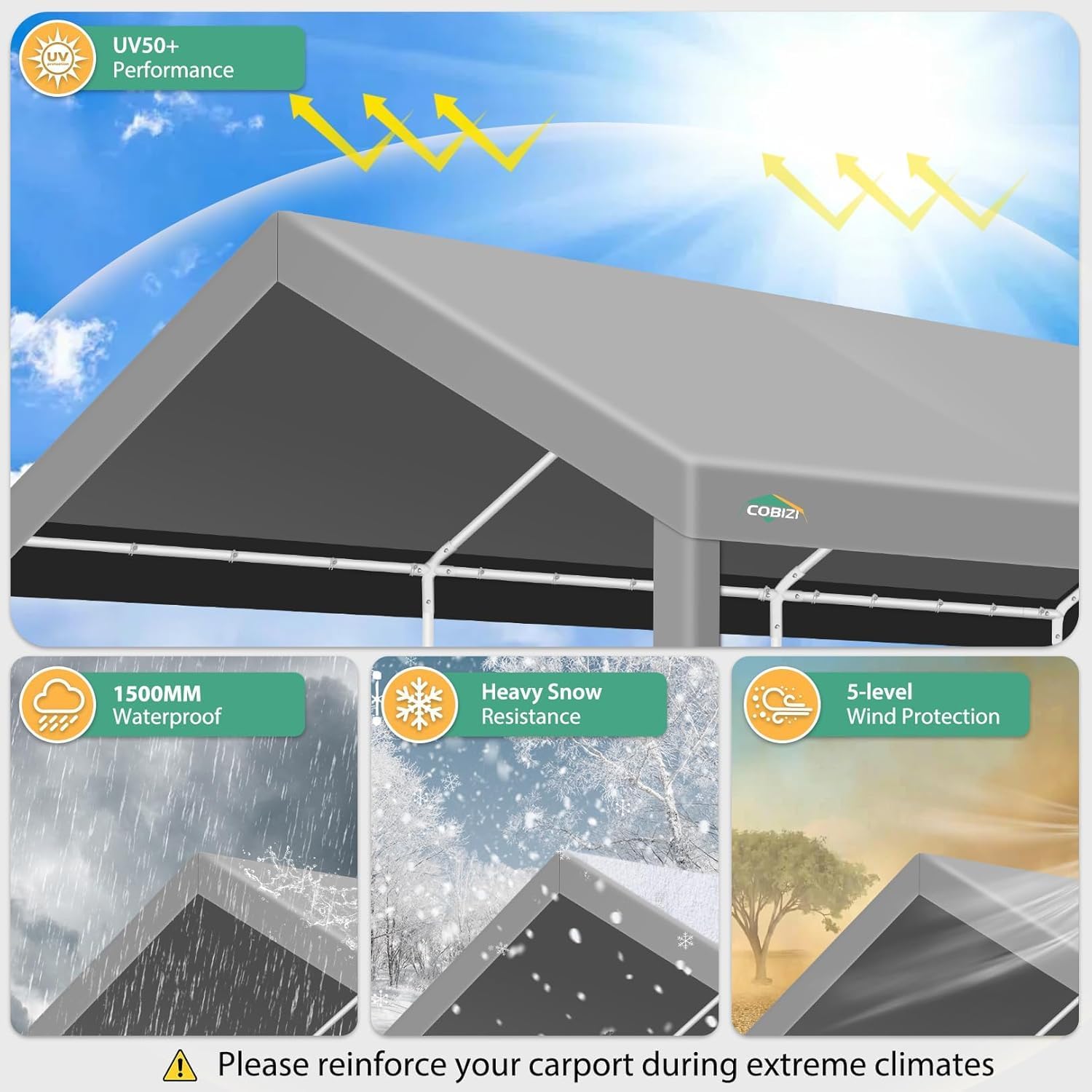 - 【Sturdy Structure】 Our heavy duty carport features 1.5-inch steel pipes with premium powder coating finish (more durable than galvanized), ensuring superior structural stability and enhanced rust/corrosion resistance. Equipped with large ground nails, wind ropes, and built-in sandbags for maximum stability.