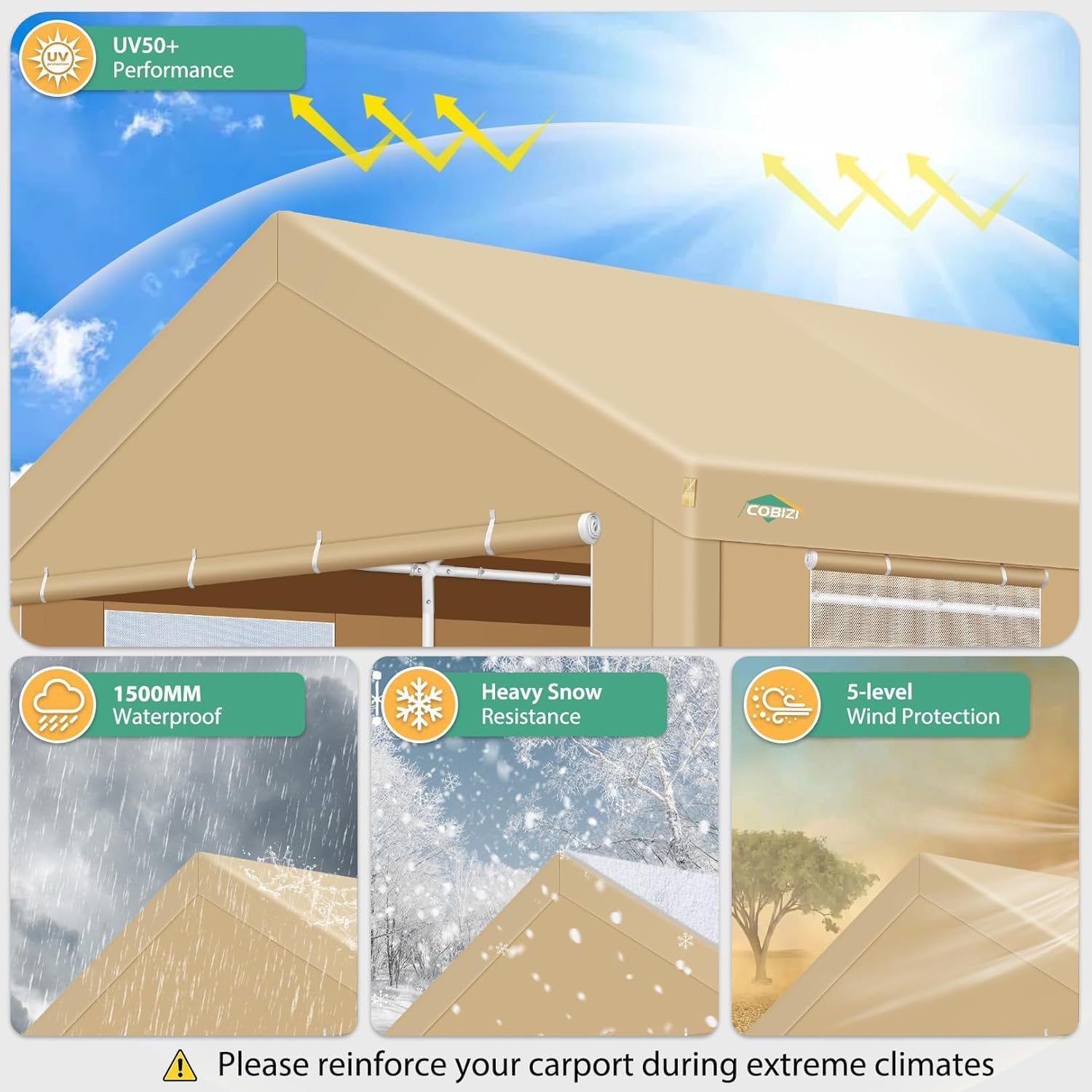 COBIZI Carport 12x20ft Heavy Duty Portable Garage, 2.0 Powder Coated Frame(Better Than Galvanized), Waterproof Shelter with Removable Sidewalls & Windows, Built-in Sandbags, for Car/Boat/SUV, Khaki