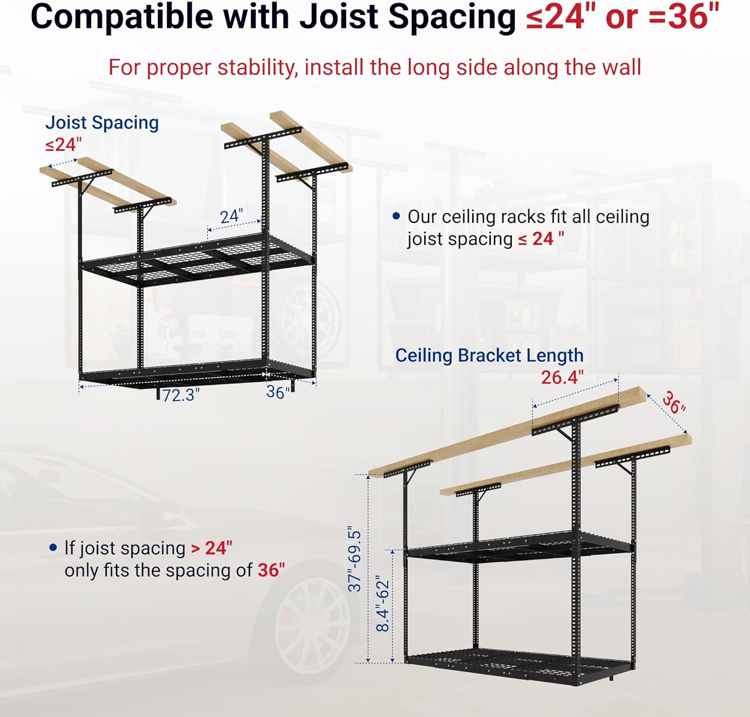 - DIY-Friendly Installation – Fits ceiling joist spacing ≤24", or 36" for wider joists. Includes template and clear instructions for fast setup, making it the ideal garage ceiling mounted rack for homeowners seeking efficient, clutter free storage solutions.