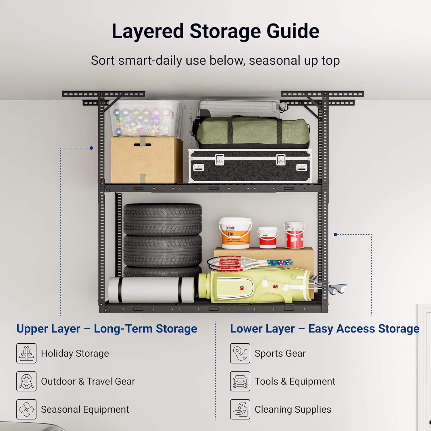- Heavy Duty Strength, Safety Tested – Built as a heavy duty metal garage ceiling storage rack, tested to 1760 lbs and rated at 880 lbs. Reinforced with diagonal support bars and anti-sway brackets, it offers unmatched stability for tools, bins, and bulky gear in any garage storage system.