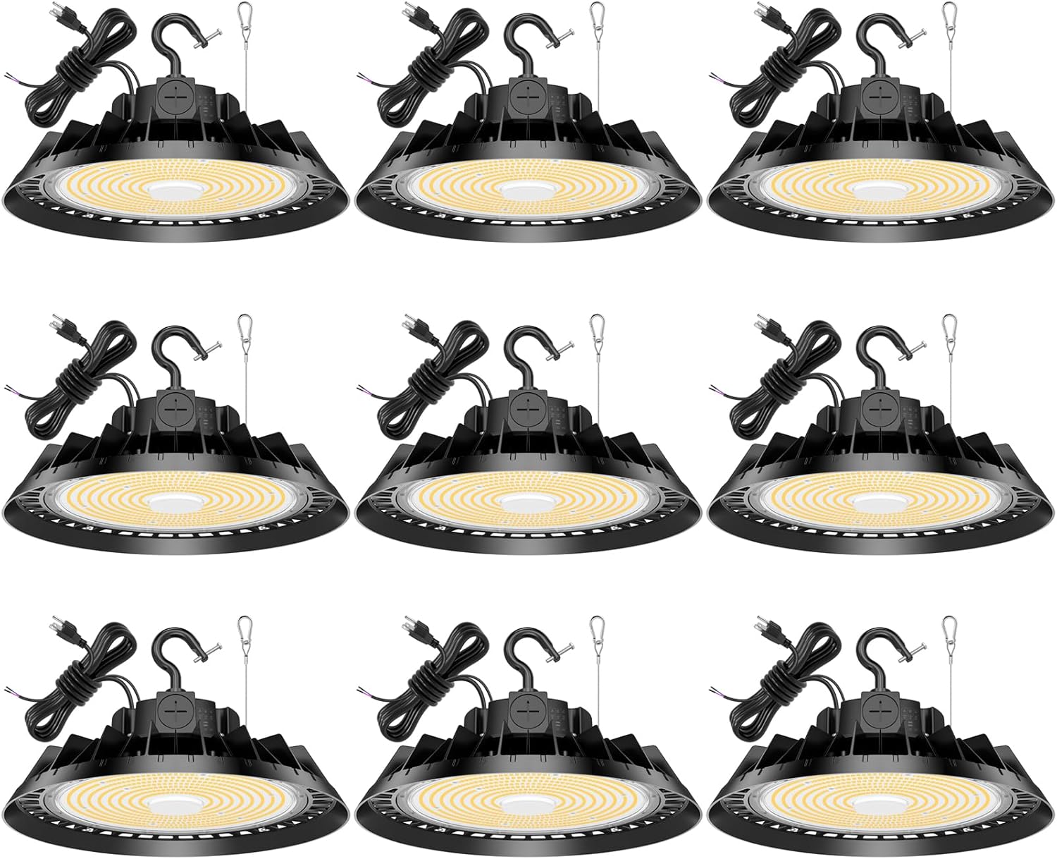 9Pack LED High Bay Lights, 240W UFO High Bay LED Shop Lights, 36000LM Adjustable CCT(5700K 5000K 4500K) & Power(240W 200W 150W), 0-10V Dimmable, 5' Cable Plug, IP65 Waterproof, ETL & DLC Listed