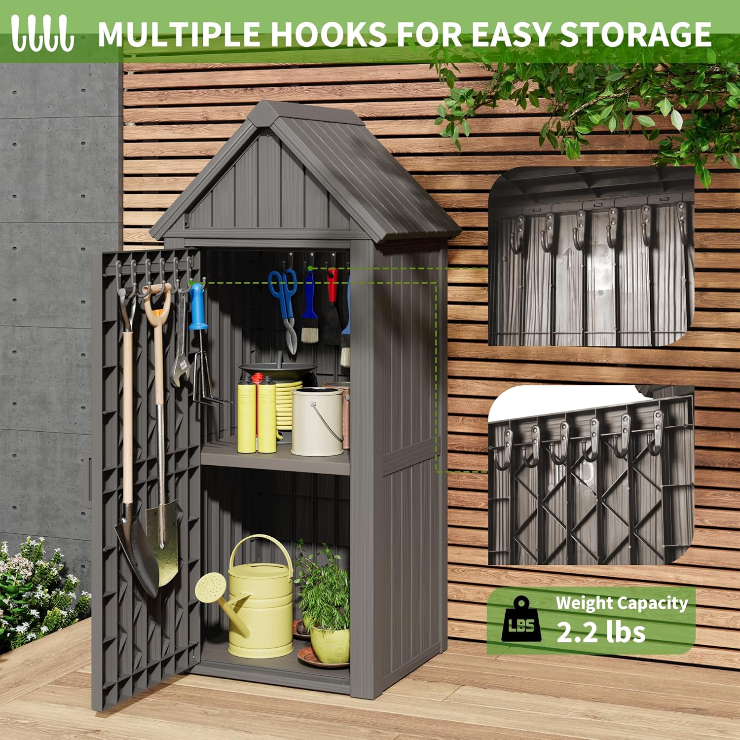 Shed Outdoor Storage Shed with Sloping Roof and Lockable Door, Resin Outdoor Storage Box Cabinet Waterproof and Multiple Hooks for Backyard, Patio, Poolside, Grey
