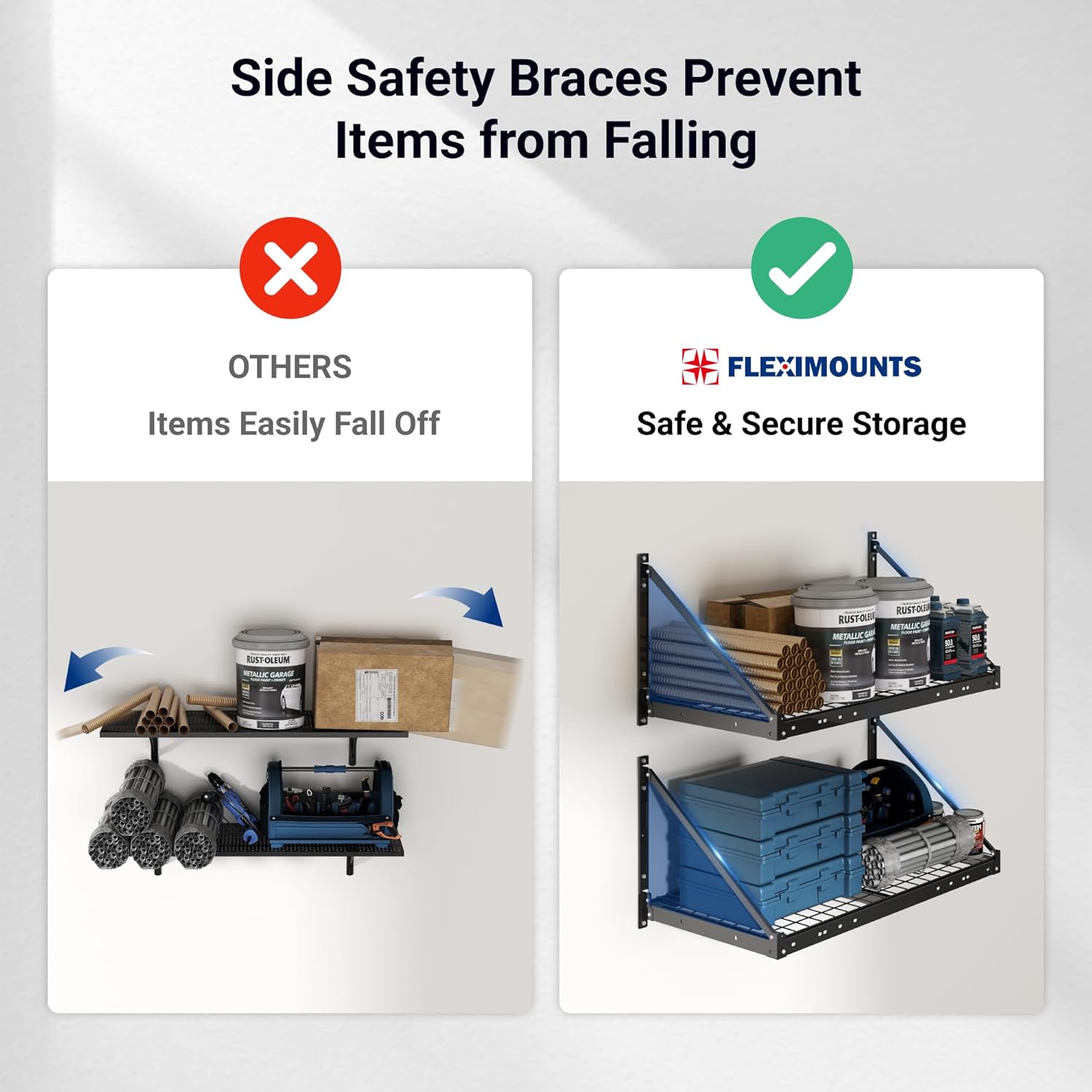 FLEXIMOUNTS 4-Pack 2x4ft Garage Wall Shelving - Heavy Duty Garage Storage System, 880 lbs Load Capacity with Brace Guardrail, Organization for Tools, Heavy Bins, Sports Equipment, Utility Room