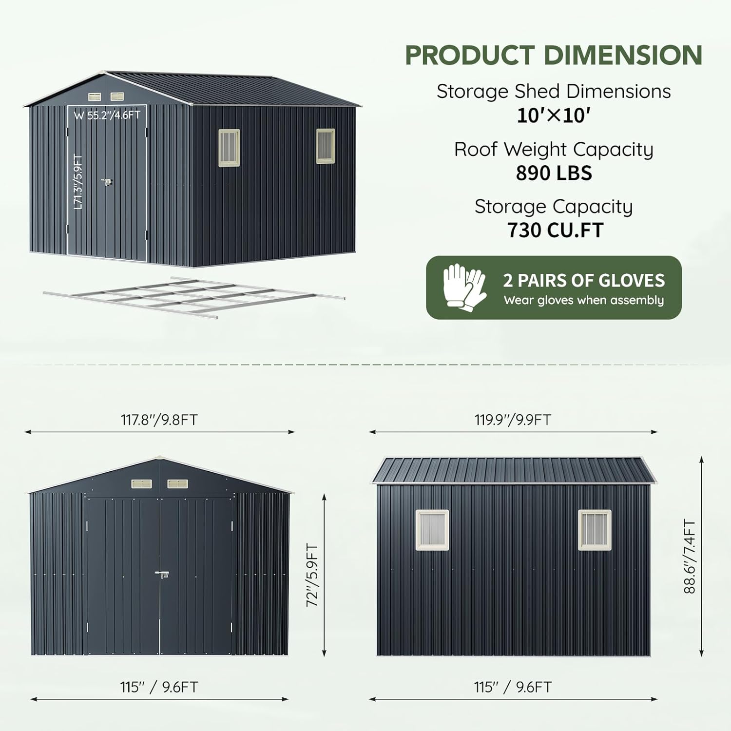 - Spacious 10x10FT Storage Capacity – Provides ample space for storing bikes, lawn tools, garden supplies, and seasonal equipment. Perfect for backyard, patio, or garden use.