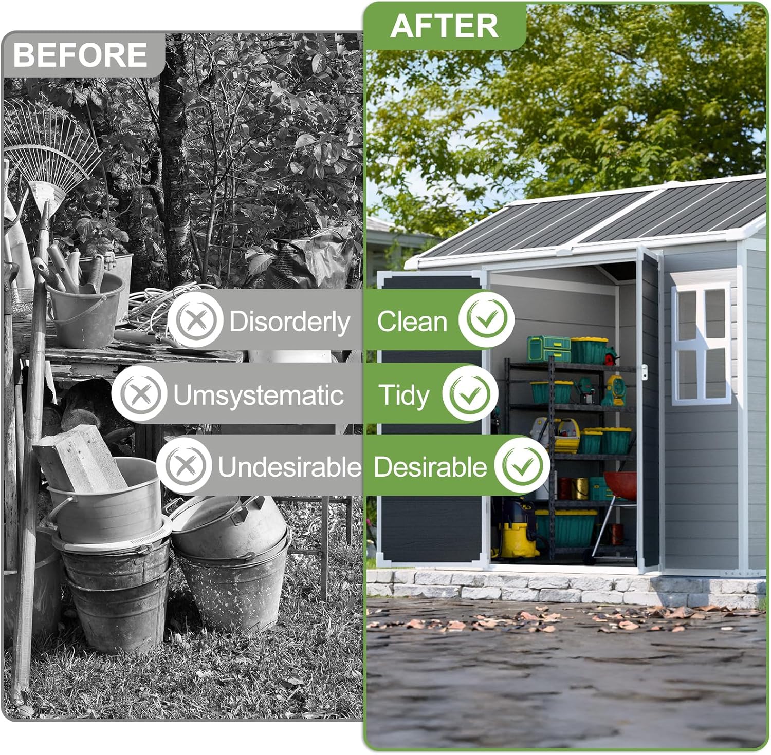 - 【Multi-functional Use】As your garden shed, utility room, to store your tools. As a warm home for your pet. You can also use it as a garbage house, where you can keep your trash cans out of sight and smell. Placed poolside and on the beach, it can also be used to store surfboards and swimming rings. Whatever you need, this shed can fulfill it.