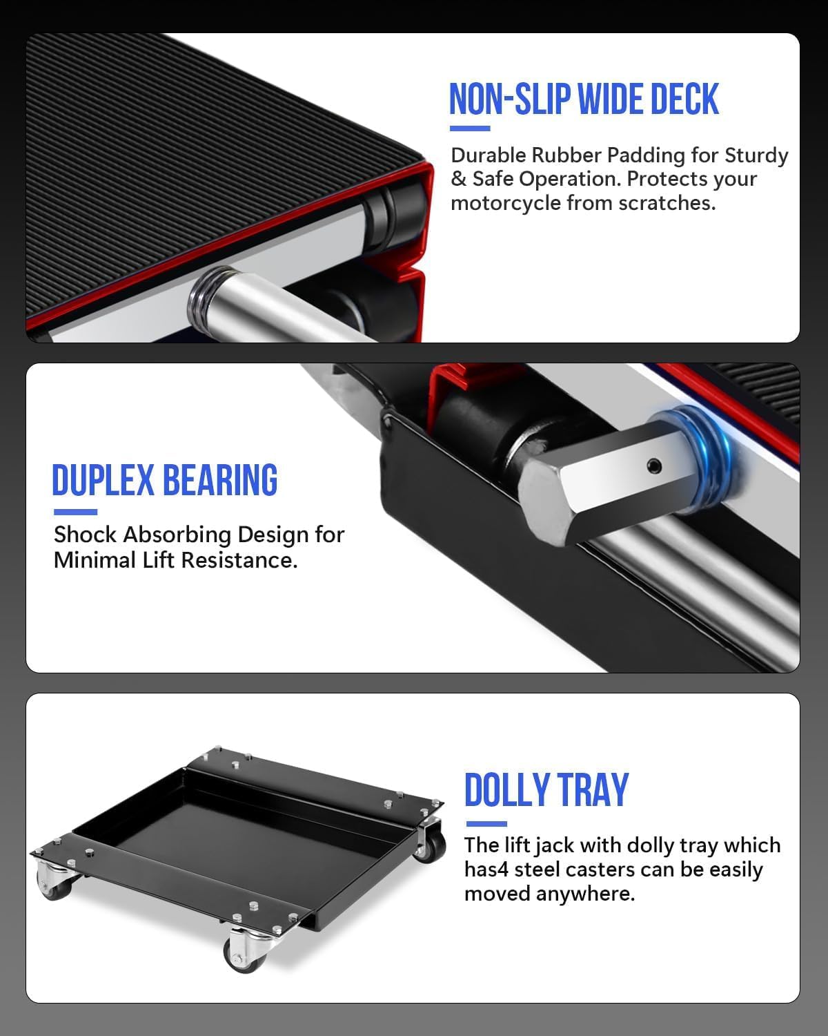 - Secure Heavy-Duty Motorcycle Stand :Engineered with a steel-reinforced frame, this motorcycle lift stand provides exceptional stability for cruisers, touring bikes, and off-road motorcycles. The extra-wide platform with non-slip rubber padding prevents scratches and slips, serving as reliable jack stands during tire changes or chain maintenance.