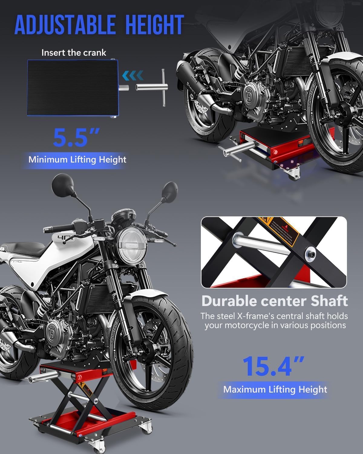 - Adjustable Height Bike Lift System : Customize your workspace with two height modes: 5.5"-15.4" (with dolly) or 3.7"-14" (without dolly). This versatile motorcycle scissor jack accommodates both low-profile and standard bikes, making it perfect for oil changes, brake adjustments, and other repair tasks as part of your motorcycle parts maintenance routine.