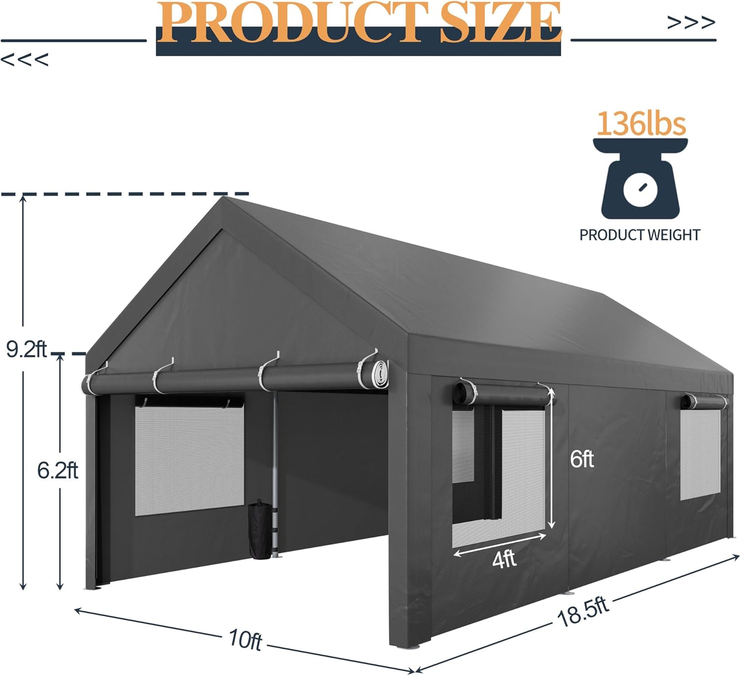 Shintenchi Carport 10' x 20' Heavy Duty Portable Garage, Carport Canopy with Side-Opening Door & Roll-Up Windows, Car Canopy for Truck,Car,Boat,Grey