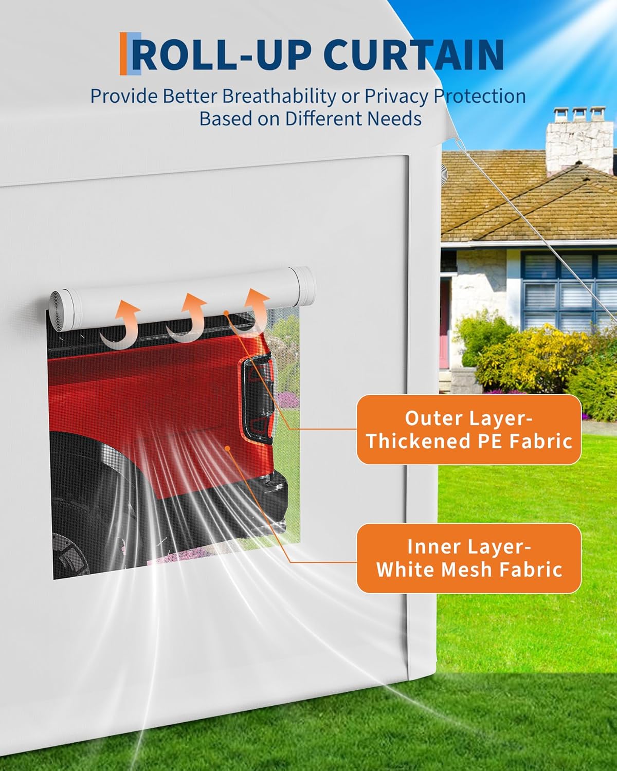 - 【Ventilated with Roll-Up Windows & Doors】Designed for convenience, this garage tent shelter features roll-up doors and windows for easy access and improved airflow. It’s versatile for parties, weddings, outdoor exhibitions, or storage—providing shaded, weather-resistant shelter.