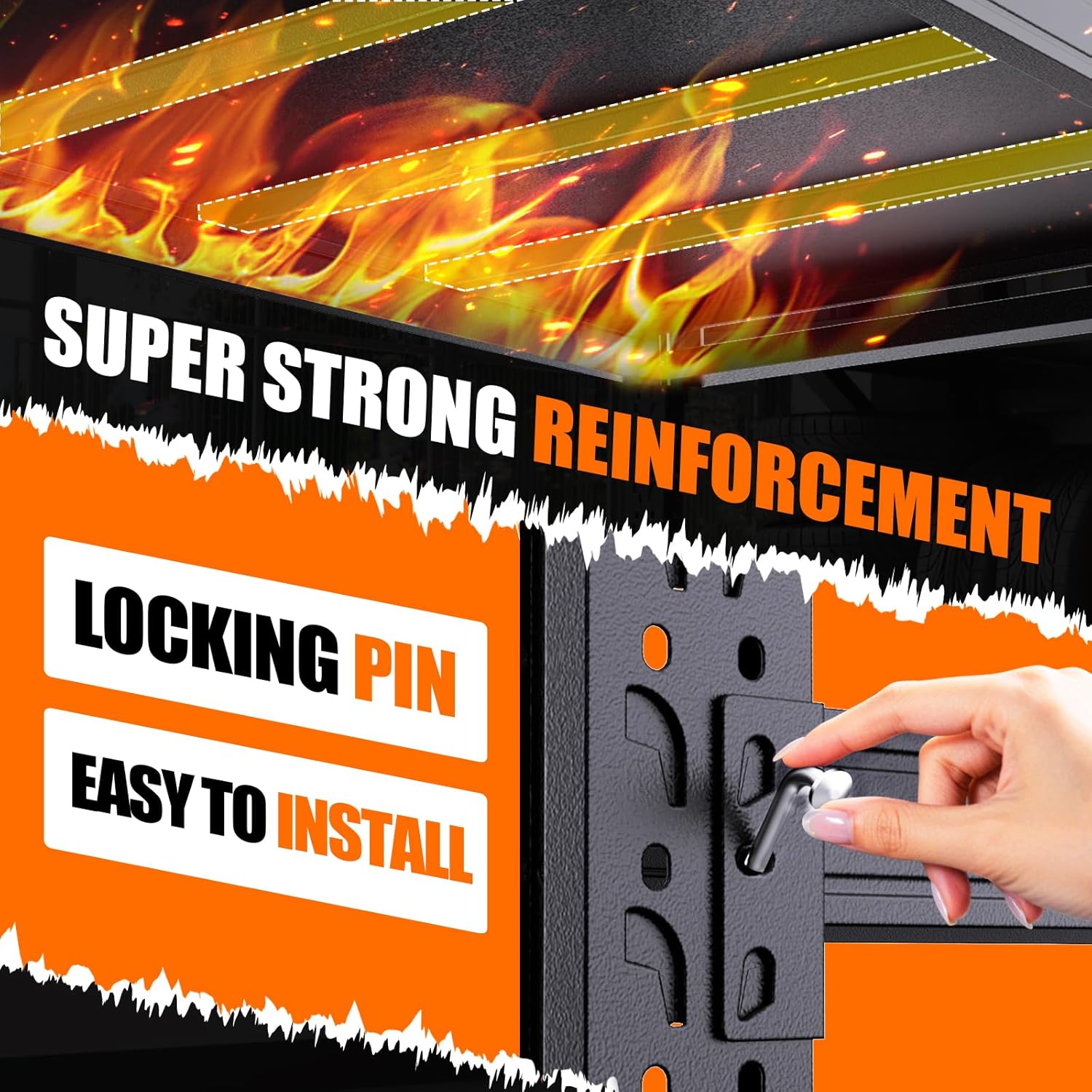- Ultra-Stable Heavy Duty Garage Shelving: This 4-tier all-steel heavy duty shelving features a continuous upright column design with seamless connections, significantly reducing risks from loose joints. Reinforced diagonal braces distribute weight evenly, ensuring rock-solid stability even when bearing loads up to 6,000 lbs. This metal shelving provides the most solid support for your garage storage, giving you complete peace of mind